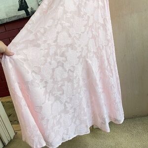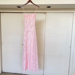 Elegant pink dress with floral pattern. Spaghetti straps. Floor-length design.