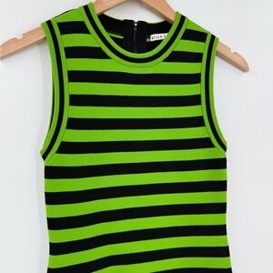 alice + olivia, alice and olivia dress, landi mini dress, striped mini dress, parrot green dress, black stripe dress, bodycon mini, wool blend dress, sleeveless mini dress, designer mini dress, statement dress, fall mini dress