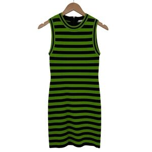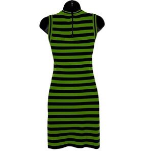 DETAILS: Sleeveless bodycon mini silhouette. Parrot green and black horizontal stripe pattern. Ribbed crew neckline and armholes. Back exposed zipper closure. Soft wool blend knit with stretch. Dry clean only.