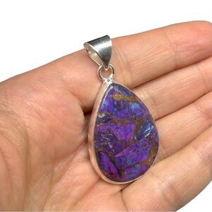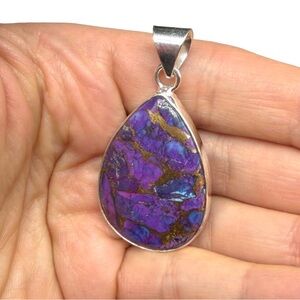 Genuine Arizona Kingman Mine purple copper mohave turquoise matrix pendant. Solid sterling silver and stamped 925. It measures approx 1 7/8” long.