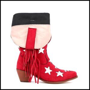 Western Knee High Boots with Stars Fringe Pull On Faux Suede Block Heel
