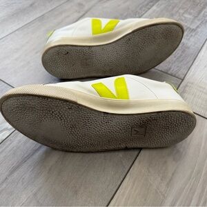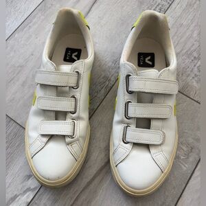 VEJA 3 Lock Leather Sneakers- white/juane fluo (neon yellow) women’s size 38/ 7