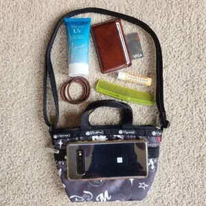 I believe this mini-crossbody bag from the Disney 100 Collection was only sold in Asia. This bag is in unused condition. This is the perfect little bag to throw in your luggage and then carry only the essentials when visiting the park. Who wants to lug around a heavy purse or tote when you're trying to have fun? Fits smartphone, small sunscreen, card holder, lip balm, hair ties, and comb (not included--just giving you an idea of size).