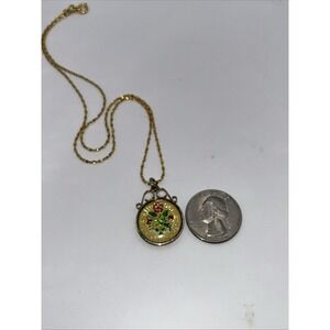 The product is a vintage pendant necklace featuring a 1967 sixpence coin and a 1962 golden hind half penny, both covered with enameled gold colored glass. The necklace measures 18 inches in length, making it a statement piece for fashion jewelry enthusiasts. The unique combination of vintage coins and enamel detailing adds a touch of nostalgia and character to this charming pendant.