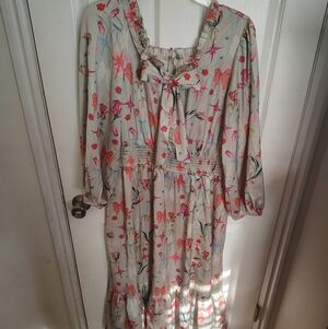 Ivy City Co XL light green dress NWOT. Charming floral dress with long sleeves. Features a tie-front detail and a smocked waist. Perfect for a casual outing.