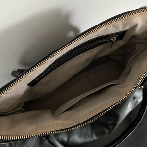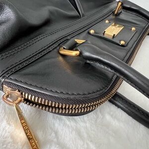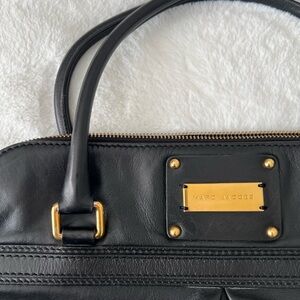 Chic black leather satchel by Marc Jacobs. Features elegant gold accents. Full zipper top. Perfect for everyday use, large enough to fit a 14” laptop.