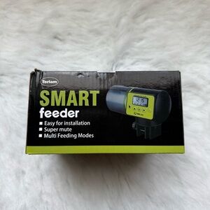 The Automatic Smart Fish Feeder offers easy installation and multiple feeding modes. Its sleek black and green design complements any aquarium setup.