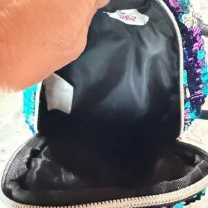 Shimmer with style using the Justice Sequin Mini Backpack. This eye-catching bag features dazzling blue and silver sequins, perfect for adding a touch of sparkle to any outfit. Ideal for carrying essentials with flair. 2 pockets 11”x9”x 3”