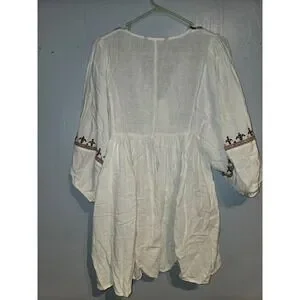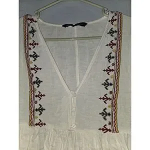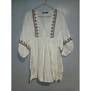 Zara Boho Embroidered White V-Neck Balloon Sleeve Mini Babydoll Dress XS