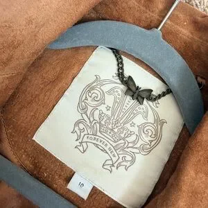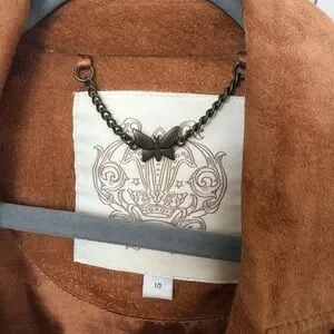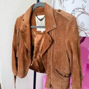Stylish tan suede jacket with fringe detail. Perfect for a boho look.