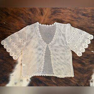 vintage-style crocheted bolero cardigan, characterized by its open-knit mesh body, short sleeves with decorative floral motifs, and. Perfect for layering.