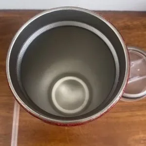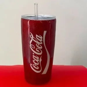 Sparkly “Coca Cola”, on front. Hand made Travel Tumbler Mug with straw. Approximately 7” H X 3 1/4” across top. Great Condition and only used a few times. Any reflection that shows a spot is from light coming in to take pics. Cup is great! No microwave or dishwasher. Hand wash. Hot + Cold Drinks. Stainless inside. Purchased at a craft fair.