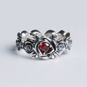 Chic silver ring with intricate floral design. Features a striking red gemstone centerpiece. Ideal for elegant style.