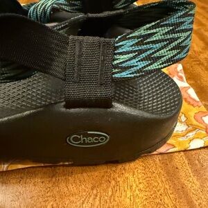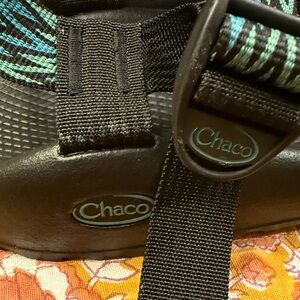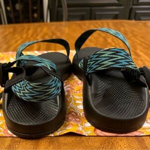 Stylish black sandals featuring blue and green zigzag straps. Perfect for casual outings.