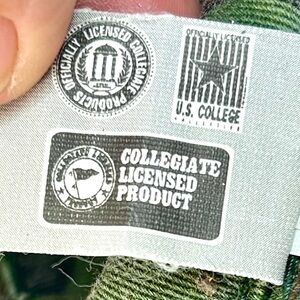 Exterior is Canes Green with orange lettering and orange swoosh. Interior is camo print. 100% cotton. Faded from age and wear but no real flaws.