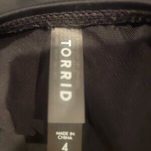 Brand New Never Worn Women's Plus Size Black Swim Suit with long 1 side skirt attached (Asymmetrical). Torrid Brand. Soft lined cups. Nylon and Spandex Pictures show under the skirt front and back as well.