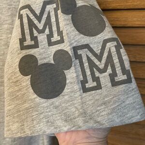 Fun Mickey Mouse design on a gray tee. The measurements are armpit to armpit 22 1/2 inches, length 26 inches. The t-shirt is 60% Cotton, 40% Polyester. The t-shirt is oversized.