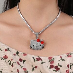 Elegant silver necklace featuring a charming cat pendant with red accents. Perfect for adding a playful touch to any outfit.
