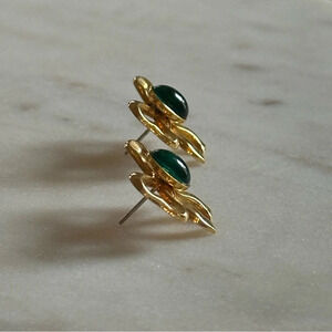 Vintage Gold Tone Bow Earrings Green Stone Coquette Dainty