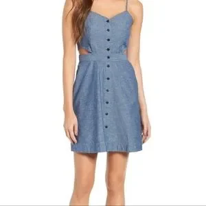 A pretty cami dress with side cutouts and buttons all the way down the front. Made of lightweight chambray, this mini is perfect for your warm-weather party lineup.