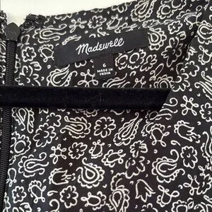 Madewell black and white midi dress with a delicate floral paisley pattern. Sleeveless design for versatile styling. Perfect for day or night. Zipper back, cap sleeves, small slit in center
