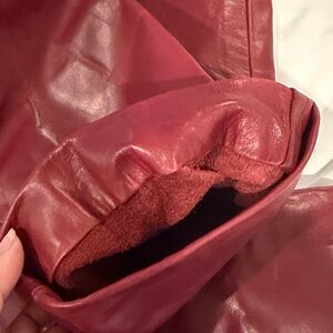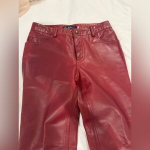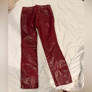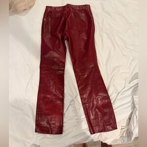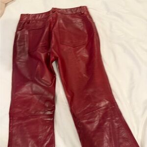 Chic red maroon genuine leather pants with a flare cut. Perfect for a bold look. Waist 28” hips 30” inseam 26” length 34.5” bottom hem that can be let out to make the pants longer is 1.5”