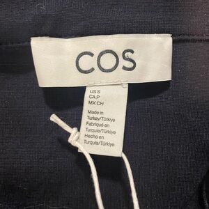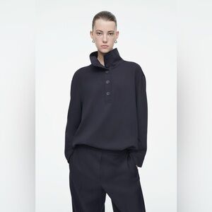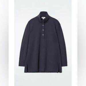 This long-sleeved top from COS is designed with a high funnel neck and a row of tonal buttons. It features curved sleeves and pleats at the back for shape. It has a regular fit and button closure.