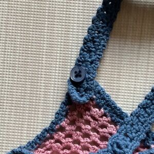 Vibrant crochet tank top with floral accents. Features a mix of colors including pink, blue, green, and orange. By Lucky Brand. Adjustable straps. Overall good condition. Colors may appear slightly different in person due to lighting.
