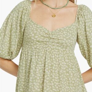 Chic sage dress with floral pattern. Features elegant long sleeves. Perfect for versatile styling.