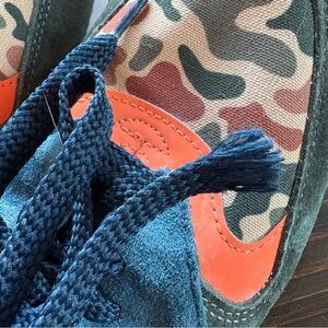 Bold sneakers with camo pattern and orange highlights. Features dark blue and black details.