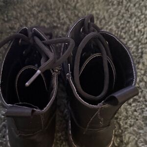 Step out in style with these sleek black lace-up woman's combat boots. Perfect for any occasion, they offer both comfort and durability. Size 10. Zipper sides.