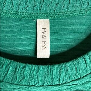 Evaless green textured short sleeve shift dress in size Large. Features a soft stretchy fabric with subtle crinkle texture, relaxed fit, and crew neckline. Easy pull-on style that works well for casual or dressy looks.