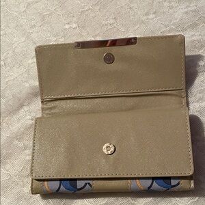 Elegant Coach wallet with a dynamic multicolor design. Features a stylish beige trim. Signature canvas, envelope size, tri fold wallet. Excellent condition.