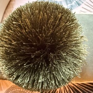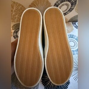 These slip-on fashion sneakers feature a Satin Lux finish in an olive green shade, officially called "Daphne". The most prominent design element is the statement oversized pom pom on the front of each shoe.
