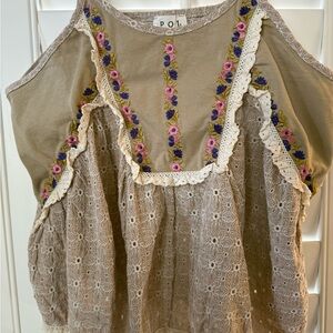 Chic POL camisole with floral embroidery. Features lace accents and adjustable straps. Perfect for layering or standalone wear. PTP 18 1/2 stretches to 22