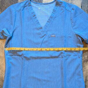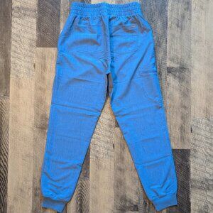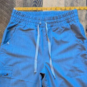 This is a Figs matching scrubs set in the limited-edition blue color Heather Indigo. It is in excellent pre-owned condition. It is a size small, and the last five images show measurements. Slim fit, ribbed ankle cuffs, elastic waistband with adjustable drawcord. The pants have six pockets in total, with one side cargo zippered pocket, one interior security pocket, two deep trouser pockets, two back patch pockets. Soft FIONx fabric with four-way stretch, moisture-wicking, anti-wrinkle, and Silvadur antimicrobial technology for odor protection and durability.