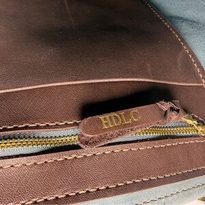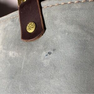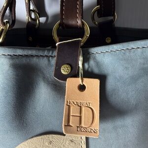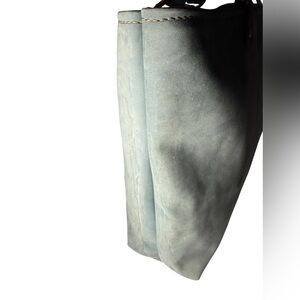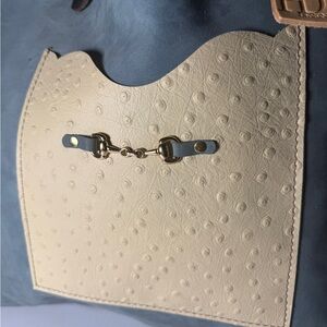 Hoofbeat designs suede tote bag . Color is a light dove gray . Has outer ostrich embossed pouch . Has a few marks. Discover the perfect blend of style and functionality with this chic tote bag. Featuring a sophisticated blue and cream design, it's ideal for any occasion. 15 x 16 with an 11 inch drop approximately. Very popular in equestrian circles.