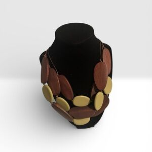Materials: Two-tone wood beads, faux leather cords, and gold-tone hardware.