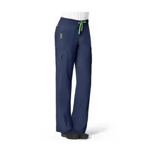 Carhartt Force scrub pants in a navy blue colorway with vibrant lime green accents and drawstrings. These performance medical trousers are constructed from a lightweight, moisture-wicking polyester-spandex blend, offering both durability and flexibility for long shifts. Designed with multiple utility pockets, including cargo space and a dedicated pen slot, they provide ample room for essential tools. The elastic waistband with an internal drawstring ensures a secure, comfortable fit throughout the day.
