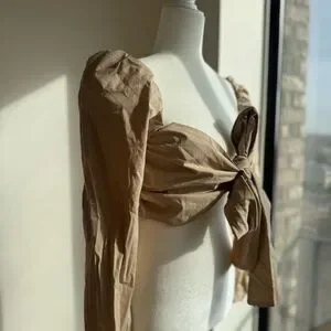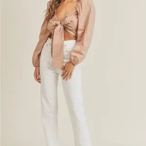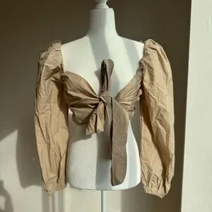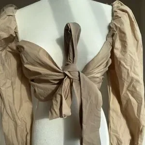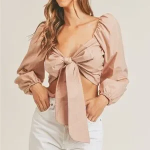 NEW Mable Angel Front Ribbon Self Tie Long sleeve puff shoulder crop top Size M