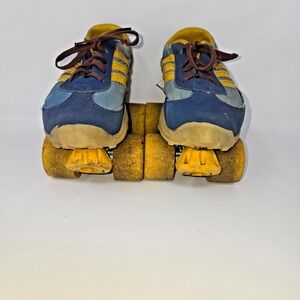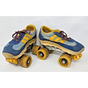 This is a pair of Adidas Nash Cruisers in Blue with Yellow Stripes in approximately a Size 13. They are 7.25 inches long. They have all original parts. These skates have significant use and signs of wear but they are complete and wheels move as intended. They do not have any rips or tears, merely expected cosmetic wear from use and age. The wheels are well-used but perfectly usable for outdoor use. The can be changed to new wheels safe for an indoor surface. They are perfectly usable as-is but could probably be cleaned and look closer to new.