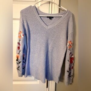 American Eagle Outfitters Light Gray V-Neck Sweater with Floral Embroidery
