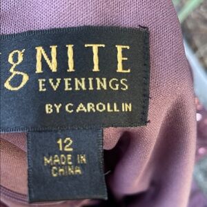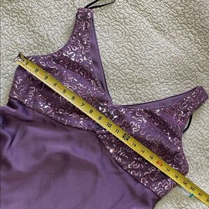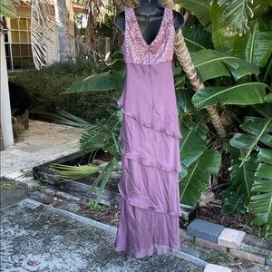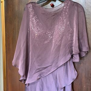 this beautiful gown begins with a sequin purple bodice that has interior pads. The skirt is an asymmetric tiered ruffle situation in a sheer poly chiffon tulle . Wear with or without the matching sheer caplet in excellent condition.