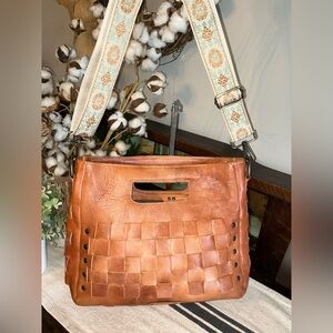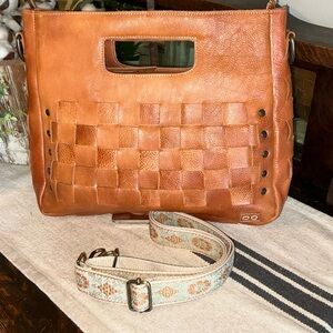 From Bed Stu, the Orchid Woven Leather Satchel Crossbody Bag features: