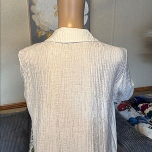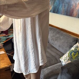 Stylish white button-up shirt dress. Features long sleeves and a classic collar, ruffled cuffs