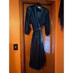 Luxurious velvet dress. Features a wrap design. Ideal for elegant events.