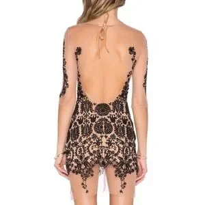 nude mesh with black embroidered design quarter sleeve bodycon mini dress with open back ties at the top