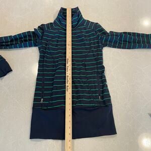 Get ready to elevate your active wardrobe with this fantastic Lululemon women's athletic full zip jacket! This stylish piece features a chic striped design in a beautiful navy and green combination, perfect for adding a pop of color to your workout gear or casual outfits.
