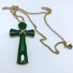 Avon Women Necklace Gold Tone Green Lucite Juliet Cross Pendant Link Chain 13 in