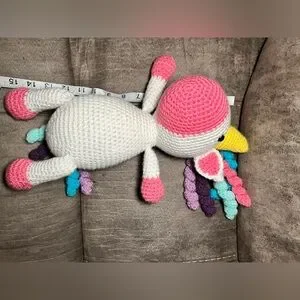 Adorable crochet unicorn plush with pink, white, and yellow accents. Perfect for kids and unicorn lovers.